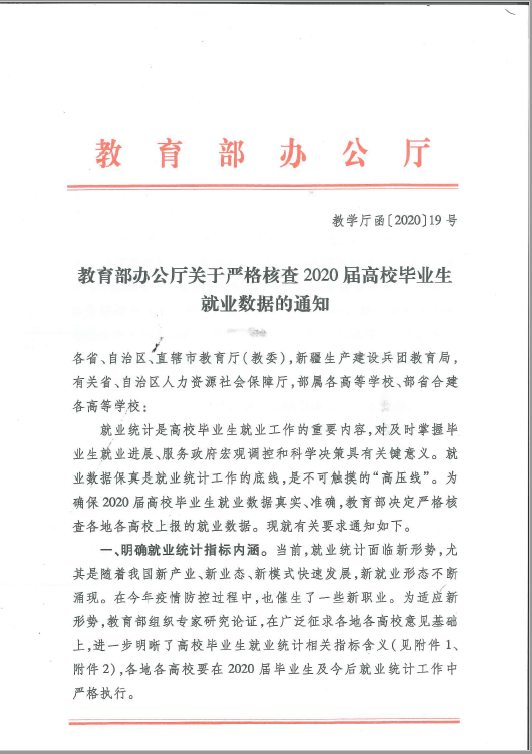 近日,多個(gè)地方教育主管部門(mén)和高校網(wǎng)站公布了《教育部辦公廳關(guān)于嚴(yán)格核查2020屆高校畢業(yè)生就業(yè)數(shù)據(jù)的通知》,明晰了高校畢業(yè)生就業(yè)統(tǒng)計(jì)指標(biāo)。