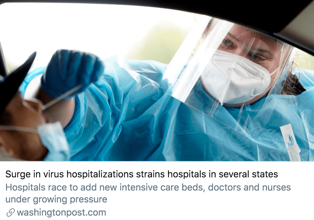 確診病例激增,美國(guó)多地醫(yī)院承受巨大壓力。/ 《華盛頓郵報(bào)》報(bào)道截圖