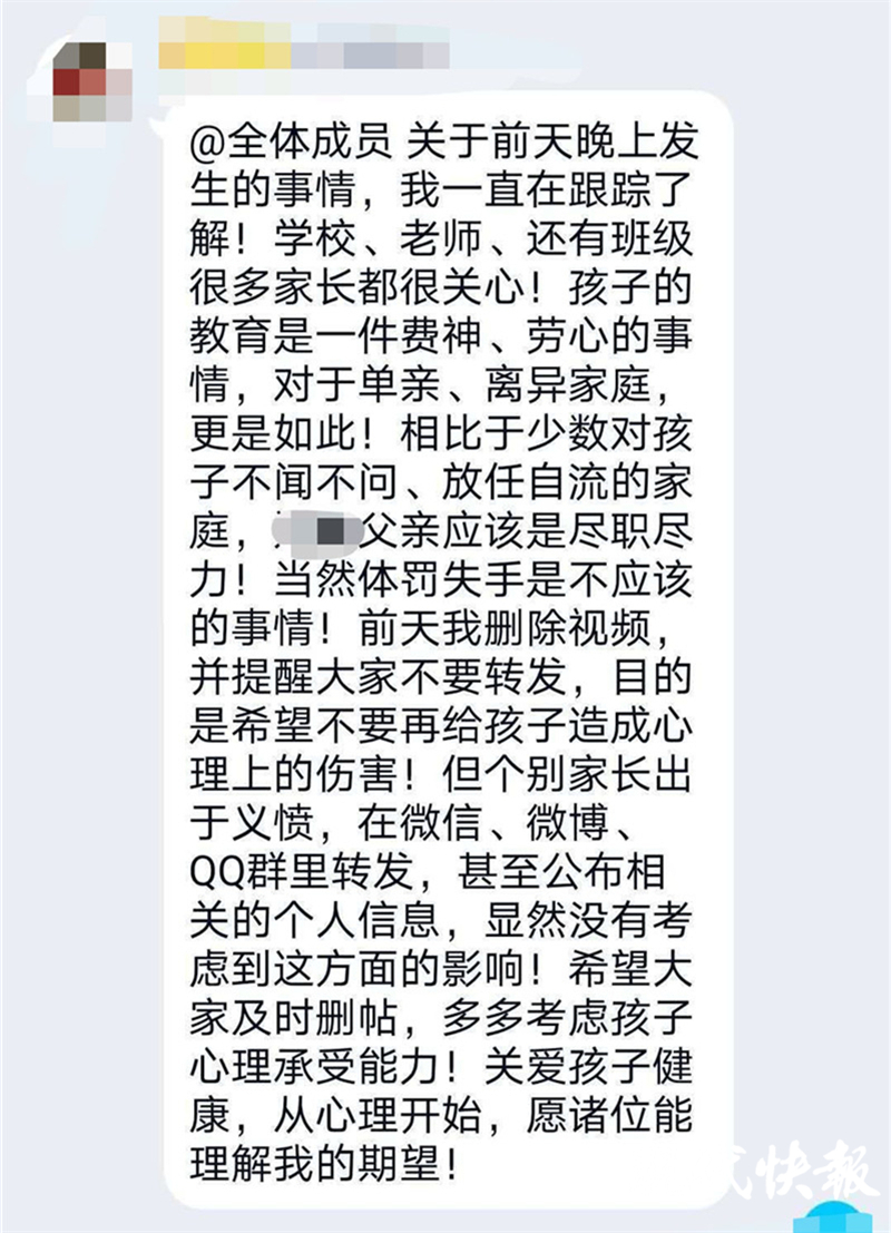 這名父親將道歉信發(fā)在班級群里后,班主任老師也發(fā)聲,表示事情發(fā)生后,自己一直在跟蹤了解,學校、老師、班級很多家長都很關心,“孩子的教育是一件費神、勞心的事情,相比少數(shù)對孩子不聞不問、放任自流的家庭,這位父親應該是盡職盡力,當然體罰失手是不應該的事情。”他呼吁家長們不要傳播視頻,“多多考慮孩子的心理承受能力,關愛孩子健康”。