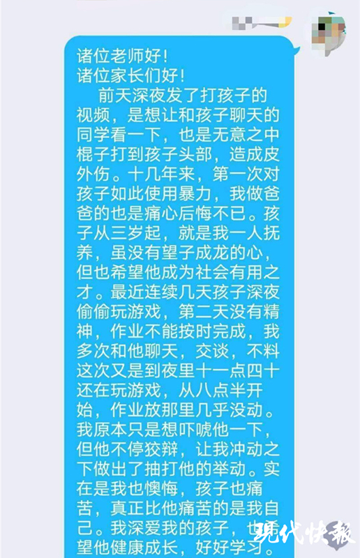 記者了解到,事發(fā)后,這名“虎爸”于8月13日上午在班級群中公開發(fā)布致歉信,他表示,“前天深夜發(fā)了打孩子的視頻,是想讓和孩子聊天的同學看一下,也是無意之中棍子打到孩子頭部,造成皮外傷。十幾年來第一次對孩子如此使用暴力,我做爸爸的也是痛心后悔不已。”