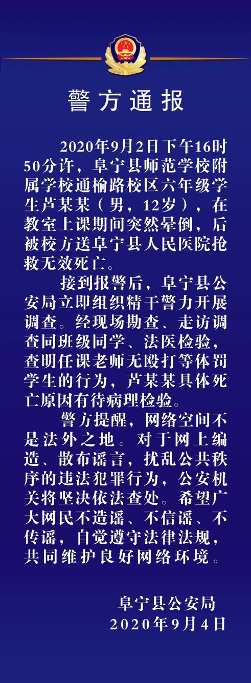 接到報(bào)警后,阜寧縣公安局立即組織精干警力開(kāi)展調(diào)查。經(jīng)現(xiàn)場(chǎng)勘查、走訪調(diào)查同班級(jí)同學(xué)、法醫(yī)檢驗(yàn),查明任課老師無(wú)毆打等體罰學(xué)生的行為,蘆某某具體死亡原因有待病理檢驗(yàn)。