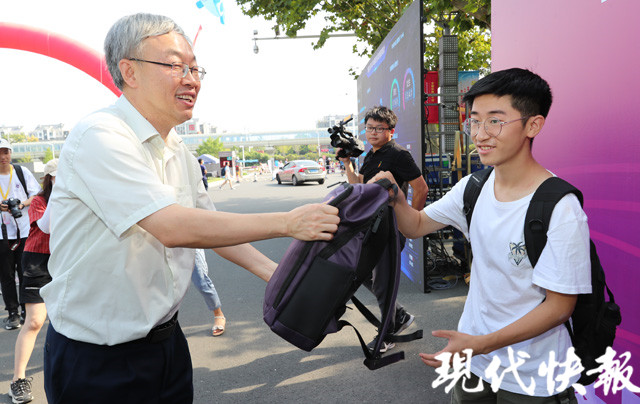 △南大校長(zhǎng)呂建為新生發(fā)放禮包 佘治駿 攝
