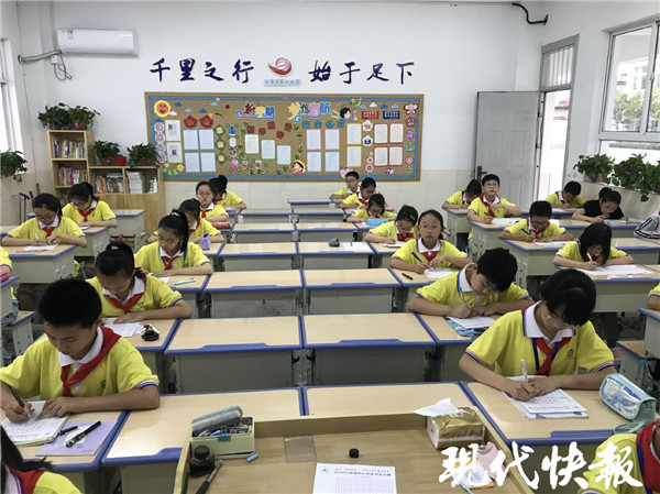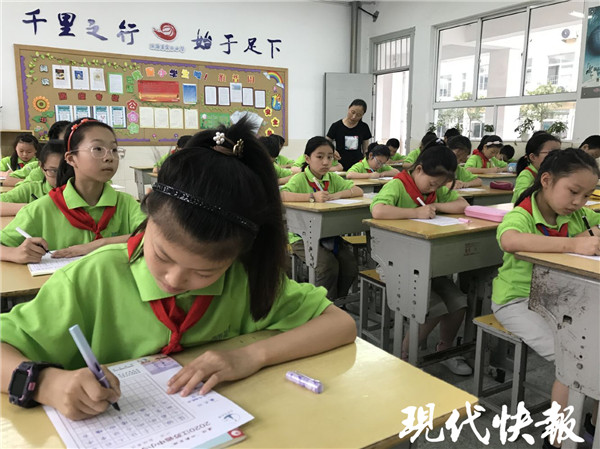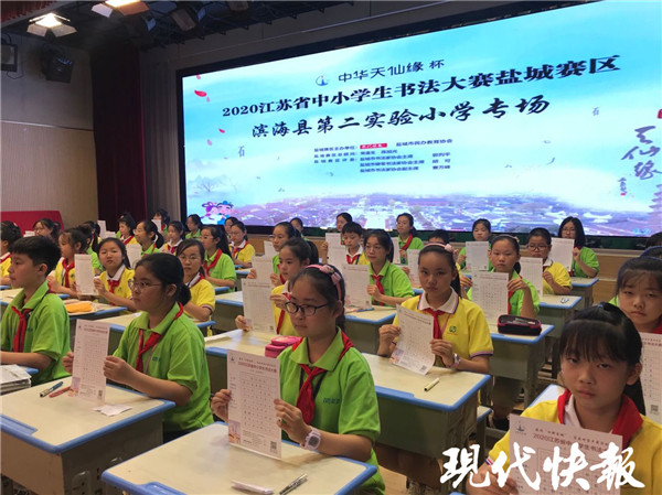 9月21日下午,濱海縣實驗小學(xué)和濱??h第二實驗小學(xué)的比賽正式開始。現(xiàn)代快報記者在現(xiàn)場看到,學(xué)生們都穿著統(tǒng)一的校服,戴著紅領(lǐng)巾,正襟危坐,一筆一畫地書寫著。