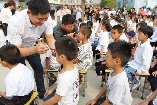 “朱砂啟智”,意為開啟智慧,以此寄托美好的愿望。學(xué)校領(lǐng)導(dǎo)和老師們用紅色的朱砂在學(xué)子們的額頭正中點(diǎn)上紅痣,從此眼明心亮,好讀書、讀好書、讀書好,衷心祝愿孩子們?cè)谝院蟮膶W(xué)習(xí)中勤奮努力,志存高遠(yuǎn)。