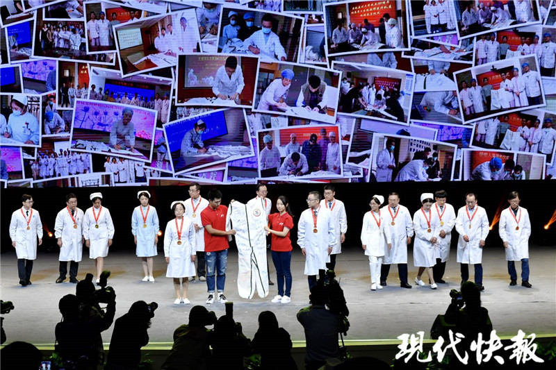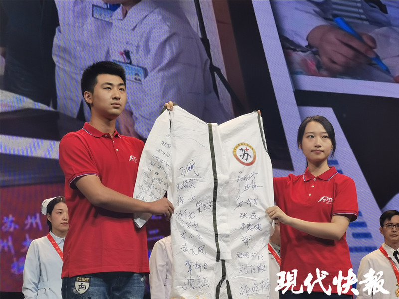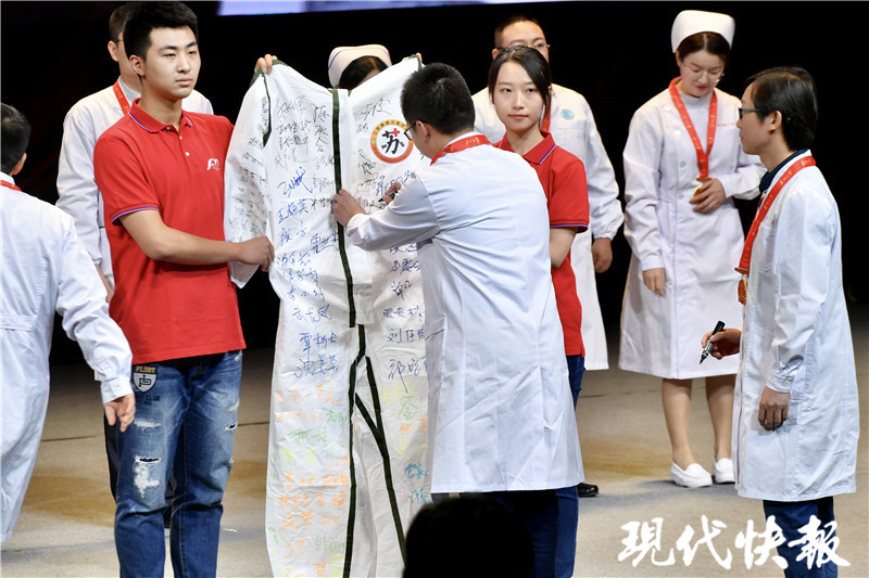 在蘇州大學紀念建校120周年發(fā)展大會上,一件簽滿援鄂戰(zhàn)士姓名的防護服亮相,這是來自蘇州大學12家附屬醫(yī)院的援鄂英雄們?yōu)槟感K蜕汐I禮。15名抗疫英雄代表登上舞臺,簽上了自己的名字,這件簽滿了204名抗疫英雄名字的防護服將被蘇州大學博物館永久收藏。