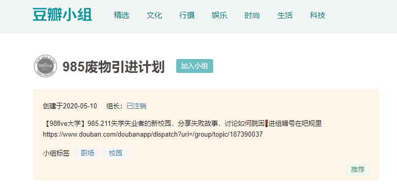 5月,一位上海大學生在豆瓣上創(chuàng)建了名為“985廢物引進計劃”的討論小組。這個小組的簡介只有一句話:“985、211失學失業(yè)者的新校園,分享失敗故事,討論如何脫困。”該討論小組在兩個月內(nèi)就吸引了8萬多人加入,且數(shù)字一直上升。