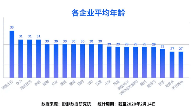 據(jù)脈脈數(shù)據(jù)研究院發(fā)布的《互聯(lián)網(wǎng)人才流動(dòng)報(bào)告2020》 (以下簡(jiǎn)稱“報(bào)告”),參與調(diào)研的19家互聯(lián)網(wǎng)企業(yè)的人才平均年齡為29.6歲,其中字節(jié)跳動(dòng)和拼多多的員工平均年齡最低,僅為27歲;滴滴出行的員工平均年齡最高,但也在35歲以下。