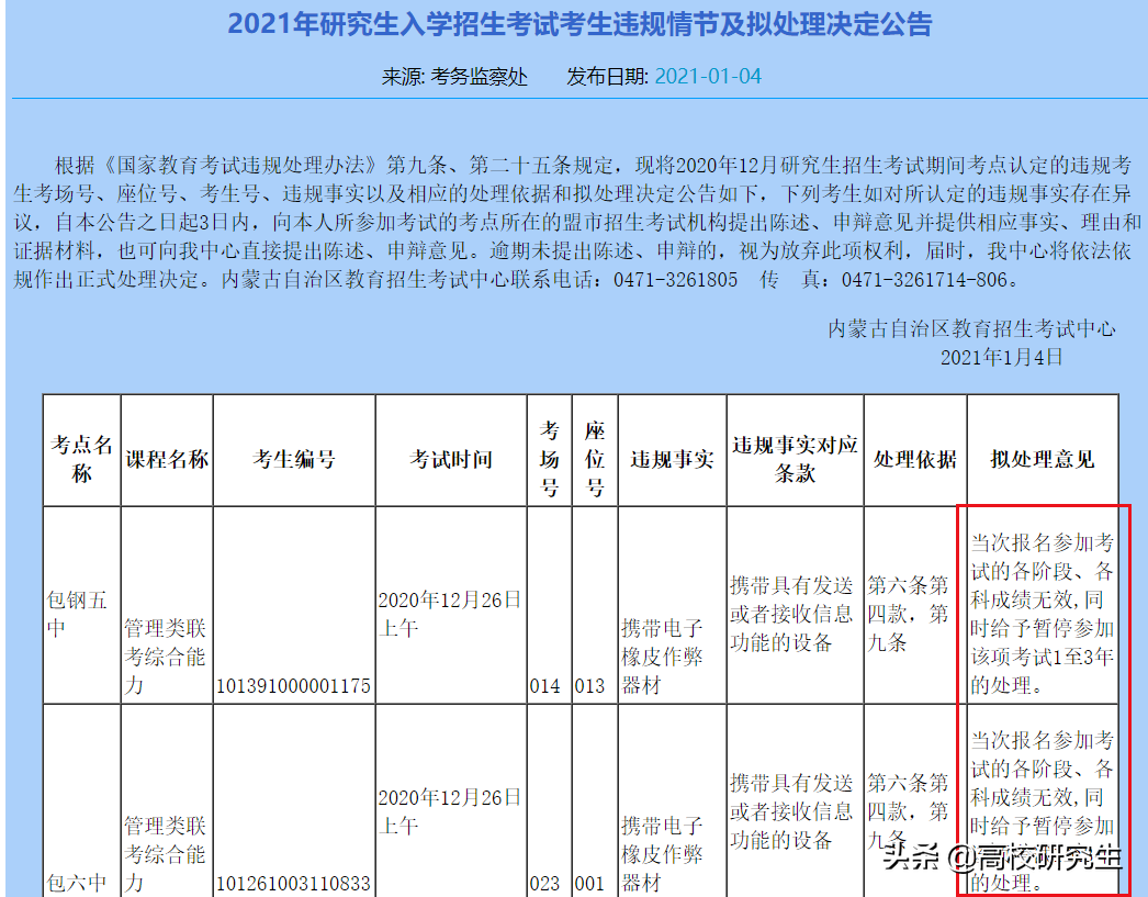近日內(nèi)蒙古和浙江兩省份公布了考研初試當(dāng)中的違規(guī)人員名單,對(duì)于這些違規(guī)考生分別給予了相應(yīng)的處分,包含取消單科成績(jī)、所有科目成績(jī),嚴(yán)重的直接禁止參加考研考試1-3年,同時(shí)教育局每年都會(huì)抽查初試監(jiān)考視頻,一些人也反映收到了教育局的電話,說(shuō)延時(shí)作答取消了單科成績(jī)!