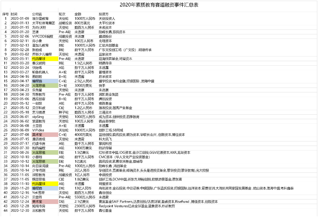 政策頻頻利好,但賽道并沒有因此火爆異常。根據(jù)公開信息統(tǒng)計,2020年,素質(zhì)教育賽道共披露融資事件44起,融資總額共計72.41億元。