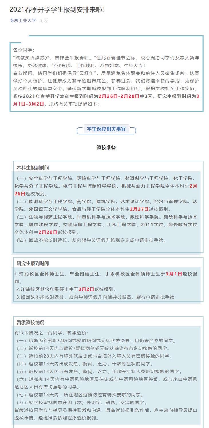 南京工業(yè)大學(xué)要求本科生按照學(xué)院分別于2月26日、27日、28日返校報到。揚州大學(xué)明確,學(xué)生將于2月27日—28日分期分批、錯時錯峰返校報到,3月1日正式上課。江蘇大學(xué)要求,學(xué)生于2月25日至28日按照指定的批次、時間和返校方式錯峰返校,3月1日正式上課,具體返校方案由學(xué)生工作組負責(zé)點對點通知到每一位學(xué)生。