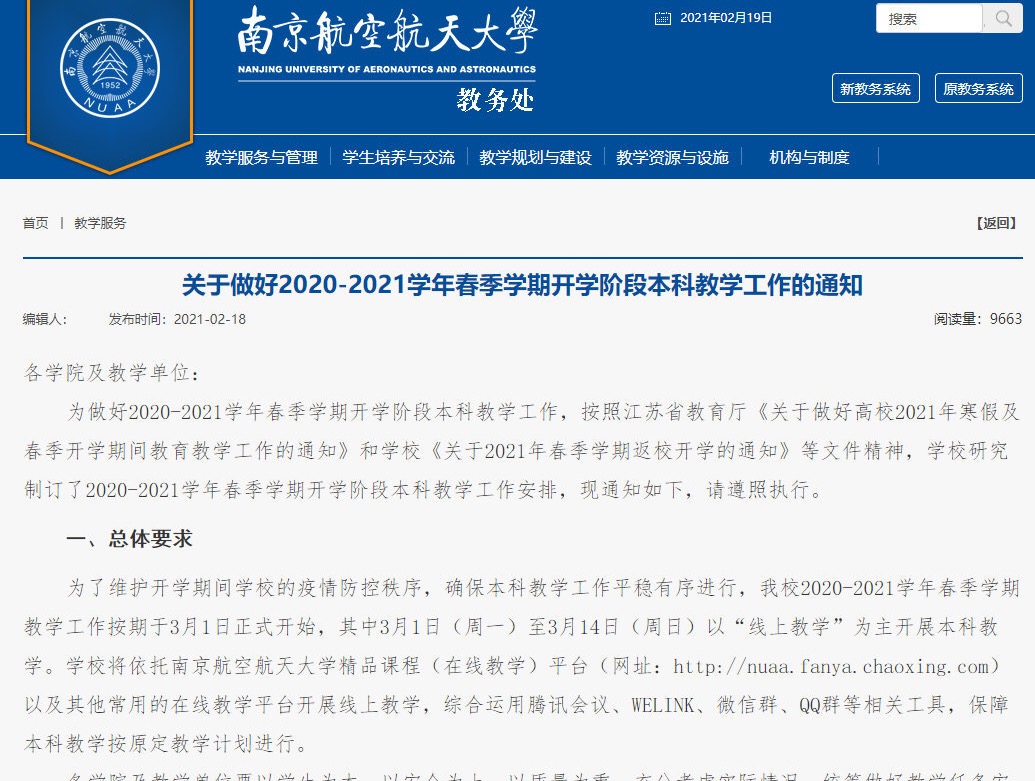 不少高校還明確,開學(xué)最初的14天內(nèi),相關(guān)教學(xué)計劃采取線上教學(xué)為主、線下教學(xué)為輔的教學(xué)模式,兩周后再開展線下教學(xué)等室內(nèi)活動,比如南京航空航天大學(xué)發(fā)布春季學(xué)期工作安排,教學(xué)工作將于3月1日正式開始,其中3月1日-14日,以線上教學(xué)為主。