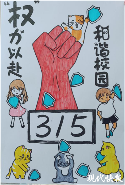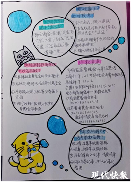 國際經貿學院的同學們開展了“和諧校園,‘權’力以赴”主題活動,手繪出生動形象的消費者維權知識宣傳單。宣傳單的正中是一只拳頭,象征著消費者的“權”力。四周可愛的“國小貓”則是國貿院學子的象征。宣傳單的背面寫有“網購預付款退不了怎么辦”“哪些霸王條款可投訴”“哪些材料可以成為維權證據”等熱議話題,并給出了詳細解答,活動豐富了同學們有關消費者權益的知識。