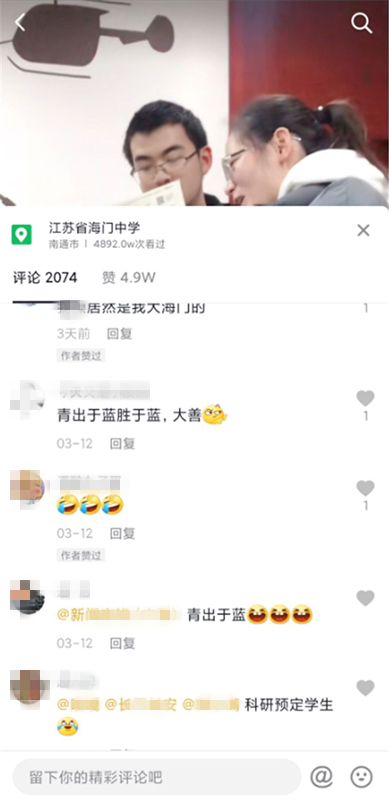 這樣融洽的場面被辦公室一名老師拍攝下來,并發(fā)在了網(wǎng)上,很快引起廣泛關(guān)注。網(wǎng)友們紛紛評論:“聞道有先后,術(shù)業(yè)有專攻。”“青出于藍而勝于藍。”“人這一輩子都在學(xué)習(xí)的路上!”還有網(wǎng)友回憶起了自己的學(xué)生時代,并表示自己高中的時候每次都是自己去問物理和化學(xué)老師問題,最后也變成了自己向老師解答問題。