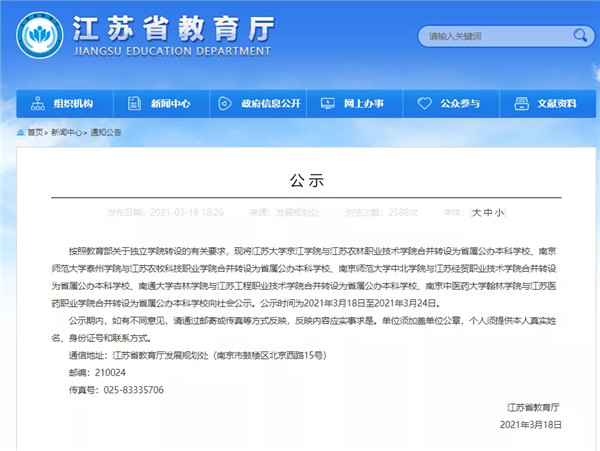公示顯示,按照教育部關于獨立學院轉(zhuǎn)設的有關要求,現(xiàn)將江蘇大學京江學院與江蘇農(nóng)林職業(yè)技術學院合并轉(zhuǎn)設為省屬公辦本科學校、南京師范大學泰州學院與江蘇農(nóng)牧科技職業(yè)學院合并轉(zhuǎn)設為省屬公辦本科學校、南京師范大學中北學院與江蘇經(jīng)貿(mào)職業(yè)技術學院合并轉(zhuǎn)設為省屬公辦本科學校、南通大學杏林學院與江蘇工程職業(yè)技術學院合并轉(zhuǎn)設為省屬公辦本科學校、南京中醫(yī)藥大學翰林學院與江蘇醫(yī)藥職業(yè)學院合并轉(zhuǎn)設為省屬公辦本科學校向社會公示。公示時間為2021年3月18日至2021年3月24日。