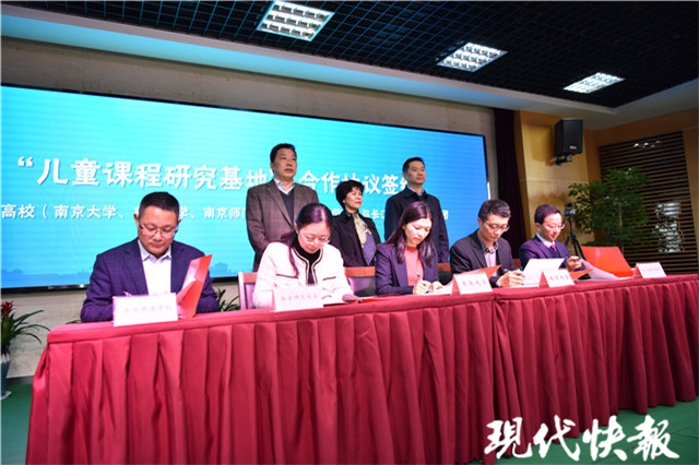 儀式上,南京大學(xué)、東南大學(xué)、南京師范大學(xué)、南京曉莊學(xué)院四所高校與長江路小學(xué)教育集團(tuán)簽訂合作協(xié)議。四所高校為長江路小學(xué)教育集團(tuán)“課程研究基地”授牌:南京大學(xué)心理健康教育與研究中心授牌“兒童心理健康教育課程研究基地”,東南大學(xué)電子科學(xué)與工程學(xué)院授牌“兒童科學(xué)技術(shù)教育課程研究基地”,南京師范大學(xué)文學(xué)院授牌“小學(xué)語文課程研究基地”,南京曉莊學(xué)院教師教育學(xué)院授牌“小學(xué)數(shù)學(xué)課程研究基地”。