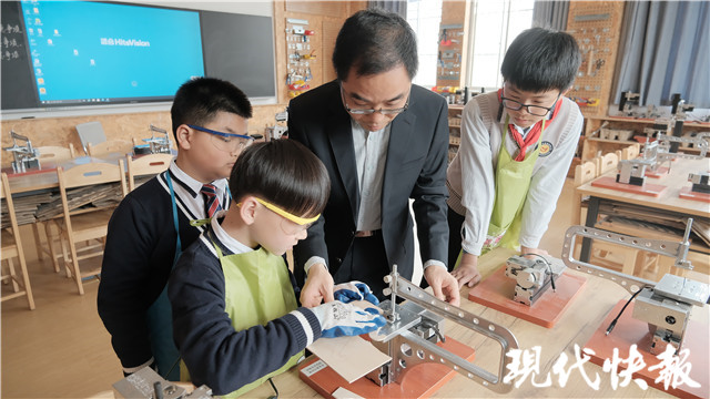 除了閱讀,維揚(yáng)實(shí)驗(yàn)小學(xué)還特別打造了500平米左右的STEM科創(chuàng)中心,內(nèi)設(shè)小魯班木工坊、科學(xué)實(shí)驗(yàn)室、教師交流區(qū)等,此外,學(xué)校根據(jù)各年級(jí)學(xué)生的特點(diǎn)自主開發(fā)了STEM系列課程,如《拯救小鳥》《智能灌溉》《智慧大棚》等,同時(shí)在班級(jí)層面建立以科學(xué)家名字命名的少科所,截至目前,學(xué)校學(xué)生共獲得了57項(xiàng)國(guó)家發(fā)明專利,有1000多人次獲省級(jí)以上科技競(jìng)賽獎(jiǎng)項(xiàng)。