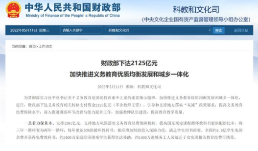 5月11日,財(cái)政部發(fā)布消息,近日下達(dá)義務(wù)教育相關(guān)轉(zhuǎn)移支付資金2125億元(不含教師工資),引導(dǎo)和支持地方落實(shí)“雙減”政策要求,提高義務(wù)教育經(jīng)費(fèi)保障水平,深入推進(jìn)薄弱環(huán)節(jié)改善與能力提升工作,加強(qiáng)教師隊(duì)伍建設(shè),提高教育教學(xué)質(zhì)量,加快推進(jìn)義務(wù)教育優(yōu)質(zhì)均衡發(fā)展和城鄉(xiāng)一體化。