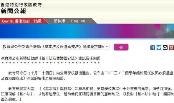 教育局今日(十月二十四日)向全港學(xué)校發(fā)出通告,公布由2023/24學(xué)年起新聘任教師必須通過(guò)《基本法》及《香港國(guó)安法》測(cè)試的要求及相關(guān)細(xì)節(jié)。