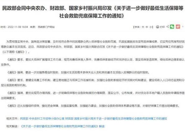 11月8日,民政部、中央農(nóng)村工作領(lǐng)導(dǎo)小組辦公室、財政部、國家鄉(xiāng)村振興局等四部門聯(lián)合印發(fā)的《關(guān)于進(jìn)一步做好最低生活保障等社會救助兜底保障工作的通知》(以下簡稱《通知》)全文公布。