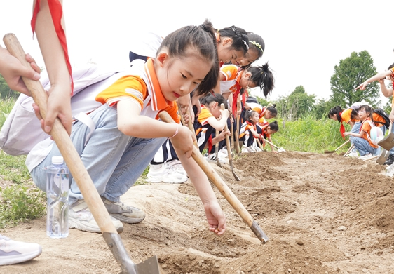 5月23日,四年級前往研學實踐基地——金盛農(nóng)莊。大家首先進行手工面粉制作,只見孩子們眼神專注,在一篩一磨之間體味勞動的快樂。隨后,孩子們拿起鏟子,種下一抹抹綠色,一棵棵蓬勃的生命在五月怒放。