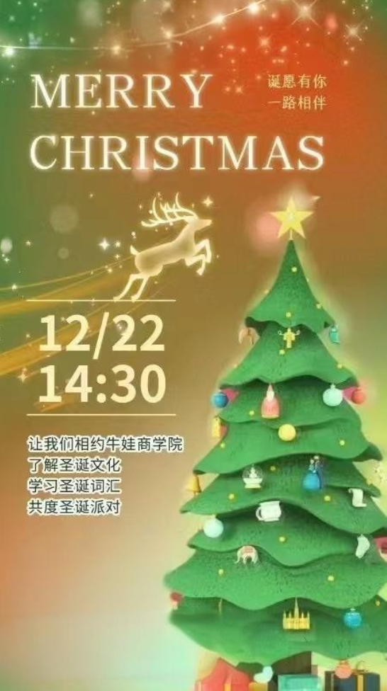 叮叮當(dāng),叮叮當(dāng),鈴兒響叮當(dāng)……當(dāng)圣誕的鐘聲敲響,牛娃商學(xué)院(位于金鷹北街區(qū)2樓)將變成一片歡樂的海洋。12月22日下午兩點(diǎn)半,我們特別邀請了新老學(xué)員及家長們,共同參加這場圣誕狂歡派對。在這里,你將有機(jī)會深入了解圣誕節(jié)的悠久歷史與獨(dú)特習(xí)俗,學(xué)習(xí)那些充滿趣味的圣誕詞匯,讓你的英語詞匯量在歡樂中悄然增長。