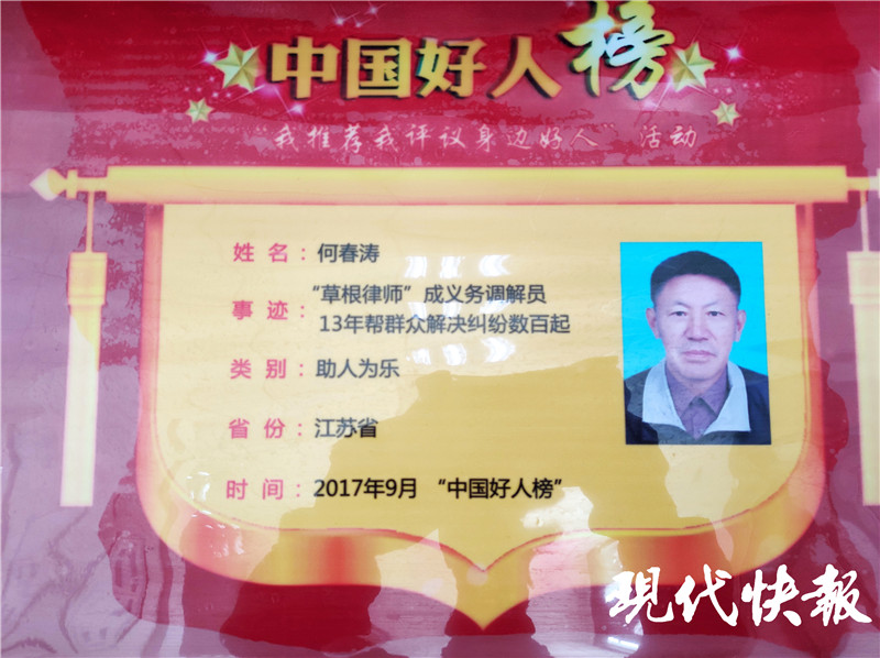 何春濤先后獲得“中國好人”“全國維護婦女兒童權(quán)益先進個人”“江蘇省十大法治人物”“江蘇省最美人民調(diào)解員”“江蘇省優(yōu)秀社區(qū)志愿者”“揚州市優(yōu)秀志愿者”等榮譽稱號。