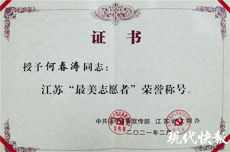 近日,中共江蘇省委宣傳部、江蘇省文明辦決定授予何春濤江蘇“最美志愿者”榮譽稱號。紅彤彤的證書拿在手上的那一刻,何春濤笑了:“老百姓需要我,我就一直做下去!”