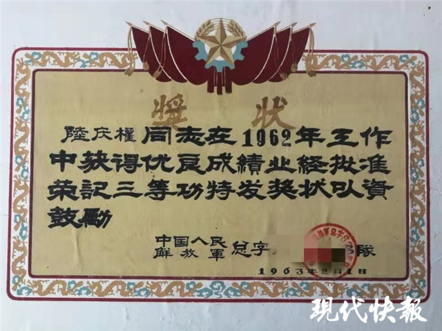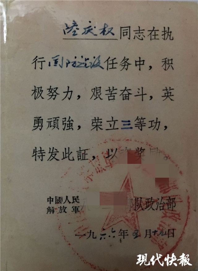 直到2019年一天,社區(qū)工作人員在登記退伍老兵信息時(shí),偶然間發(fā)現(xiàn)陸慶權(quán)的三等功獎(jiǎng)狀,才揭開(kāi)了這段塵封已久的往事。“這些事情組織上已經(jīng)給了我證書(shū),沒(méi)必要拿出來(lái)顯擺,也不允許顯擺。”陸慶權(quán)說(shuō),要不是看到報(bào)紙、電視上播原子彈相關(guān)的新聞,他是絕對(duì)不會(huì)講出來(lái)的。
