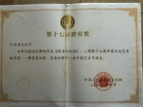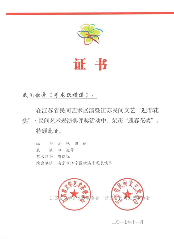 人們清楚地記得《手龍躍橫溪》這個(gè)舞蹈吧?說起它呢,還真有一段要好好說的故事呢。同行們都清楚地記得,當(dāng)年創(chuàng)編這個(gè)舞蹈時(shí)也可謂是難度相當(dāng)大。作為主創(chuàng)人員之一,田迪首先要考慮到手中的道具如何能運(yùn)用好。因此,在舞蹈動(dòng)作元素編創(chuàng)上,首先考慮提煉了古典舞中的一些身法,對(duì)手龍進(jìn)行必要的改編。如加入的云手,腳下圓場(chǎng)、踏步翻身、點(diǎn)翻身、劃八字等身法,并在手持龍的基礎(chǔ)上進(jìn)行動(dòng)作,這無(wú)疑加大了舞蹈的難度,尤其是對(duì)于沒有舞蹈基礎(chǔ)的阿姨們來說,難度可想而知。特別是田迪和編導(dǎo)組設(shè)計(jì)的“八字甩龍”,就得讓演員腳下扎馬步,利用留頭甩頭和手臂的劃八字來完成,動(dòng)作就像是龍?jiān)诤@酥蟹瓭L的感覺;“舉龍”則是運(yùn)用單吸腿的動(dòng)作,龍尾扣在腰間,左右上下高舉龍頭,表現(xiàn)龍從云中探出頭的感覺;“云手繞龍”則是將古典舞中云手帶入動(dòng)作中,腳下為十字步,展現(xiàn)龍?jiān)诳罩斜P旋的樣子,期間還要運(yùn)用一些花鼓燈的元素。在“云手繞龍”和“龍珠戲龍”等環(huán)節(jié),除了動(dòng)作的編排上既要考慮到精煉、必需\可承受,更多的還是要在上水平、上檔次上下功夫。對(duì)此,要想讓自己傾心編創(chuàng)的作品能帶來滿意的收效,別無(wú)選擇,田迪帶頭在八月的酷暑下指導(dǎo)、帶頭參加排練。整整一個(gè)“三伏”,既當(dāng)“老師”、“陪練”、“示范”、“指導(dǎo)”的她,還要負(fù)責(zé)后勤保障、倒茶遞水、接送供飯……所吃的苦、所受的累,用當(dāng)時(shí)主要負(fù)責(zé)這次創(chuàng)編工作的文化館負(fù)責(zé)人趙燕的話說,是“吃盡了苦頭,耗盡了精力,用盡了智慧,流干了汗水……”而最后回報(bào)田迪她們的是:圓滿完成了初賽和復(fù)賽兩次考驗(yàn),在全省展演和評(píng)比中,一舉拿下江蘇省五星工程獎(jiǎng)金獎(jiǎng)!