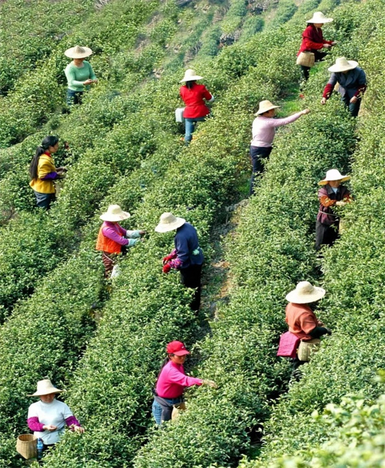 每到春季清明前后,沉睡了一冬的茶樹(shù)吐出了綠色。這時(shí)采茶的姑娘們便開(kāi)始忙碌起來(lái),每天天剛蒙蒙亮,便三五成群背著竹簍頭戴竹笠到茶園采茶,她們穿著花花綠綠的衣服,宛若一只只美麗的蝴蝶在綠色的茶園里翩翩起舞。采茶須得心靈手巧,眼神兒好,茶樹(shù)上剛剛冒出的綠芽宛若繁星,須得眼疾手快的把她們摘下來(lái),一個(gè)人正常一天只可采一斤多鮮茶芽尖,約莫一萬(wàn)多個(gè)芽頭,這一斤多芽尖只能炒制成一二兩新茶,由此可見(jiàn)采茶要求之高以及其中勞動(dòng)的艱辛,好茶之名貴自有她的道理。
