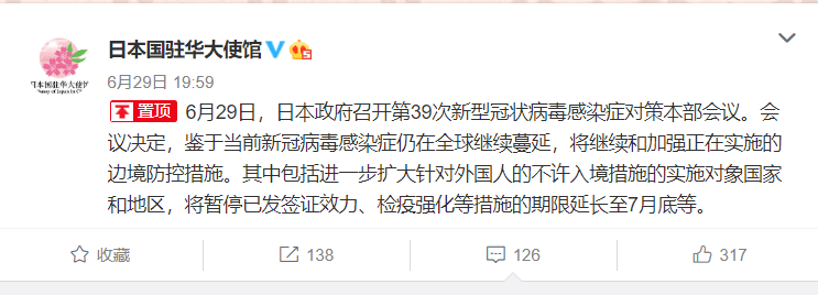 昨日,日本駐華大使館也發(fā)布了針對(duì)中國(guó)人的最新措施:針對(duì)新冠肺炎疫情在國(guó)外疫情擴(kuò)大的現(xiàn)狀,日本政府決定在現(xiàn)階段政策實(shí)施的基礎(chǔ)上,采取以下措施: