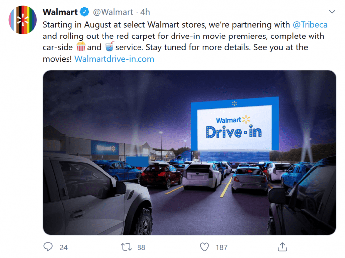 據外媒報道,沃爾瑪日前剛剛宣布了一項令人驚訝的計劃--利用其現(xiàn)有的房地產來恢復一種基本已不復存在的觀影方式,即把一些門店的停車場改造成汽車電影院。據該公司披露,這種影院將于8月初開始上線。沃爾瑪在Twitter上宣布了這項新計劃,并已經推出了一個網站來展開宣傳。