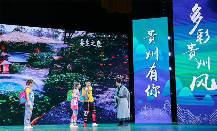 活動現(xiàn)場,隨著悠揚婉轉(zhuǎn)的音樂響起,一位樸素打扮的行者和一位背著包的游客陸續(xù)登上舞臺,走過壯美山水的光影布景……在兩人的帶領(lǐng)下,多彩貴州的大幕向觀眾徐徐拉開。原來,他們一位是“徐霞客”,一位是現(xiàn)代“背包客”,兩人穿越時空,聯(lián)手在舞臺上帶領(lǐng)觀眾領(lǐng)略貴州各地獨特的民風民俗和美麗的山水風光,展現(xiàn)了貴州3州6市“新、奇、特、美”的自然景色和獨特的人文風貌。