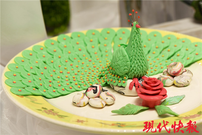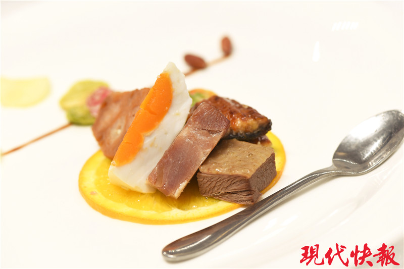 李增主要負(fù)責(zé)的是一道冷菜,菜名正是本次活動的主題“水韻江蘇”。蓮葉田田,錦雞翹首,紅花綻放,取“錦上添花”的美好寓意,餐盤的右上角還有紫檀色澤的花窗,盡顯江蘇韻致。“這些畫面都是食材切成薄片疊起來碼放的,荷葉用的是青蘿卜,錦雞的羽毛是南瓜,花窗是方火腿。”聽了李增的介紹,記者湊近一看,才發(fā)現(xiàn),原來所有的圖案都不是擺件,而是薄如紙片的食材堆疊而成。