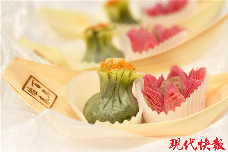 月牙蒸餃擺放在正紅色的漆器食盒里,一口即食的松鼠鱖魚像一朵鮮花綻放,棒棒糖大小的八寶鴨,一口入嘴,鴨皮的鮮香和糯米的軟糯一同襲來。菱角、蓮藕組成的冷盤是水鄉(xiāng)最好的饋贈,翡翠燒賣和荷花酥?jǐn)[在船型的紙碗里,和菜品展示臺上的小橋流水景觀遙相呼應(yīng),盡顯運河元素。