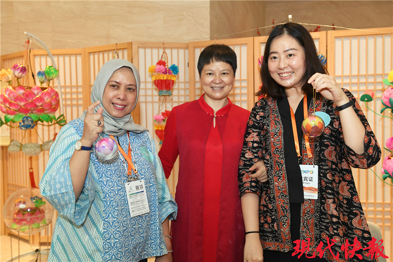 走進(jìn)南博非遺展示區(qū),一盞盞五彩斑斕、小巧精致的荷花燈,立即吸引了國際友人的目光。制作花燈總共需要62道工序,秦淮燈彩國家級非物質(zhì)文化遺產(chǎn)代表性傳承人顧業(yè)亮如數(shù)家珍。