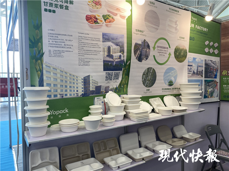 在今年的餐博會上,現(xiàn)代快報記者還看到不少一次性餐具生產(chǎn)企業(yè),無錫江陰的一家企業(yè)帶來不少可降解打包盒參展。“現(xiàn)在江蘇也出臺了升級版的限塑令,有了明確的時間表,餐飲企業(yè)還是很注意的,前來咨詢的也不少。”該展位銷售人員說,他們的產(chǎn)品是甘蔗漿為原料,大約90天就可降解,非常環(huán)保。“相比塑料餐盒成本會增加50%左右,但隨著限塑令升級,推廣可降解餐盒也是趨勢。”對方介紹,今年以來,他們明顯感覺國內(nèi)訂單增加了不少。
