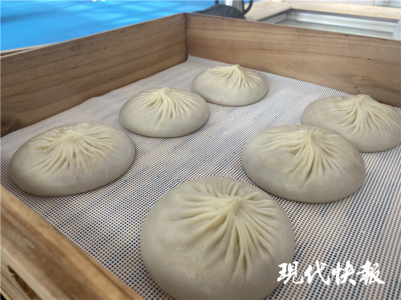 在一家蟹黃湯包參展商的展位前,不少觀眾排隊在等剛出籠的湯包,大廚現(xiàn)場揉面、搟皮、包湯包,動作嫻熟行云流水一般。“每只湯包大概有28-32個褶子,餡料130克左右。”該品牌銷售負責(zé)人賈先生說,他們與螃蟹基地有常年合作,湯包所用螃蟹都是現(xiàn)拆的蟹黃和肉,保證食材新鮮美味。