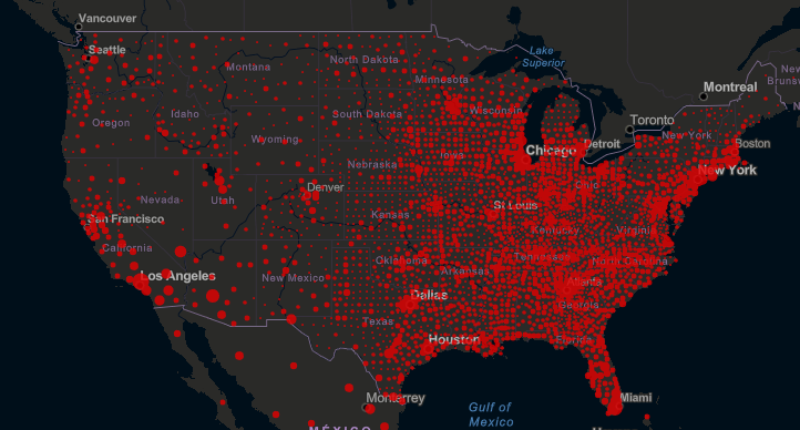 美國疫情分布圖(約翰斯·霍普金斯大學(xué))
