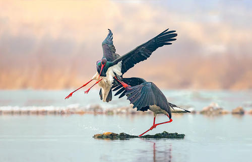黑鸛屬鸛形目、鸛科,國家一級保護動物,目前全世界僅存3000只左右,珍稀程度不亞于大熊貓,屬于國寶級珍禽。其體態(tài)優(yōu)美,頸、腳很長,嘴和腳紅色,周身羽毛除胸腹部為白色外,其余都是黑色。黑色羽毛在不同角度的光線下,可以變化多種顏色,絢麗奪目。