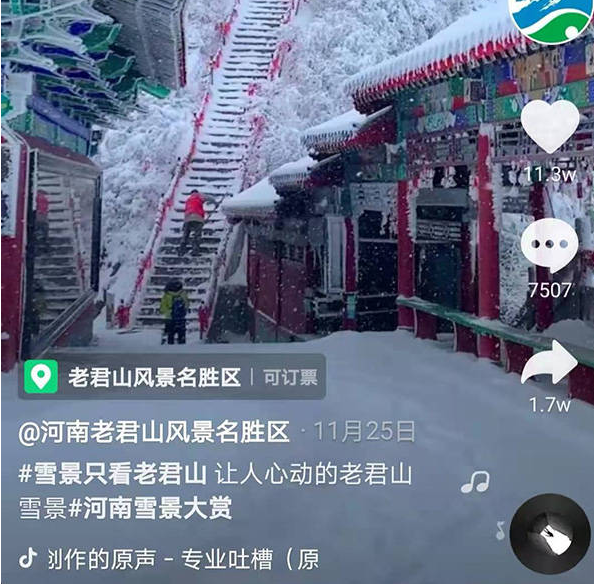 澎湃新聞注意到,老君山雪景的視頻在短視頻平臺上廣泛傳播。不少博主發(fā)布自己在山頂穿漢服或吃泡面的視頻,有視頻獲贊百萬。