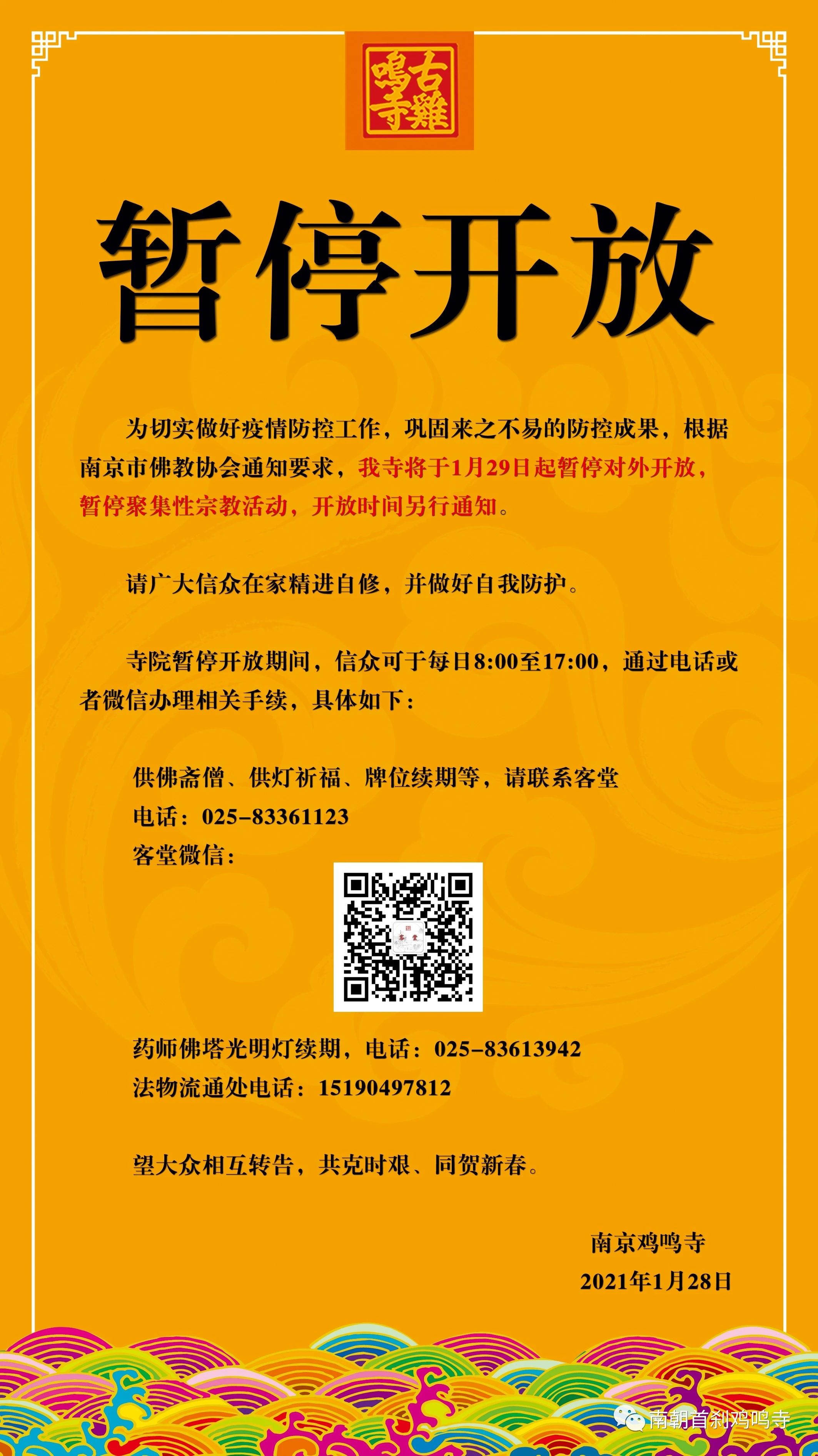 (記者 李鳴)1月28日晚,南京雞鳴寺發(fā)布公告,稱為切實(shí)做好疫情防控工作,鞏固來(lái)之不易的防控成果,根據(jù)相關(guān)通知要求,將于1月29日起暫停對(duì)外開放。