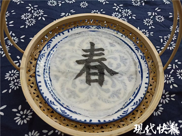為了讓一家人的春節(jié)更有氛圍,陳正銀2月初就開始琢磨美食。“那天正好是立春,家里準(zhǔn)備了一些‘春’餅,我愛人在一旁寫毛筆字,我就突然來了靈感。”陳正銀想到,薄薄的“春餅”不就像宣紙嘛,宣紙上能寫字,在春餅上寫字會(huì)怎么樣?于是,他找來黑芝麻并磨成糊狀,在春餅上寫了個(gè)“春”字。“都說腹有詩書氣自華,把‘墨汁’吃到肚子里,新的一年也能收獲知識(shí)。”陳正銀很滿意這個(gè)作品。