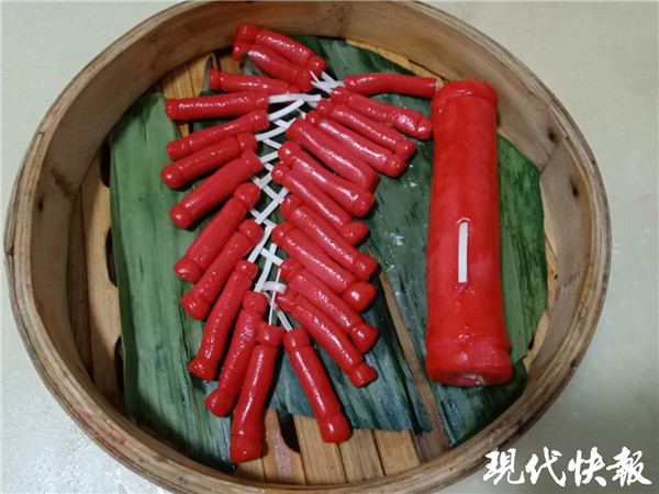 除了“春”餅和“福”糕,陳正銀還制作了可可愛愛的“氣氛組”糕點(diǎn)。“今年是牛年,我就用南瓜、糯米和可可粉,做了一籠小金牛,健康好吃還有節(jié)日氣氛。”陳正銀告訴記者,其實(shí)他每年都會(huì)結(jié)合當(dāng)年的生肖,做成糕點(diǎn),今年已經(jīng)是第十年了。此外,陳正銀還用糯米和紅色的食用色素做成”鞭炮”,給春節(jié)增添熱鬧。