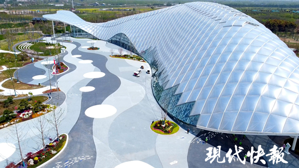 而走到園區(qū)的東北側(cè),遠(yuǎn)遠(yuǎn)就能看見的建筑也吸引了許多人氣,這就是被稱為“江豚”的國際館。國際館是揚州世園會的“點睛之筆”,整個館高30多米,長250多米。國際館的設(shè)計主題為“江海之戀”,靈感來源于長江中的江豚,建筑造型喻意“江豚游弋”。這座“有生命、會呼吸”的綠色建筑會隨天氣、光線變幻色彩點亮世園會,在開園期間承擔(dān)國際花卉展示、花卉園藝競賽、配套服務(wù)區(qū)等功能。