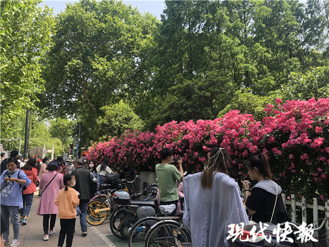 為了避堵,游客們紛紛乘坐公共交通前往總統(tǒng)府,這也帶火了南京圖書館的一面薔薇花墻。在大行宮地鐵三號(hào)線5號(hào)出口,不少游客都沉醉在長(zhǎng)達(dá)百米的紅色薔薇花海中。