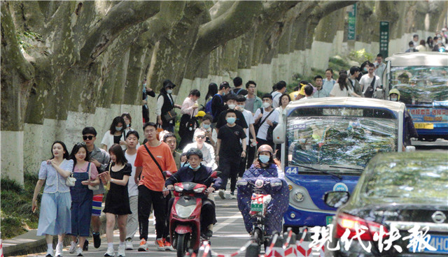 等待觀光車的隊(duì)伍排成了“S”形,不少游客選擇步行上山。路過的明孝陵、美齡宮等景點(diǎn)人頭攢動(dòng),有些隊(duì)伍排到了棧道上。好在蜿蜒的陵園路兩側(cè),參天的法桐林立,綠意盎然濃蔭掩映。伴著微風(fēng)陣陣,游客們?nèi)齼蓛?、走走停?!?/p>