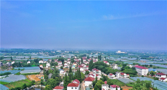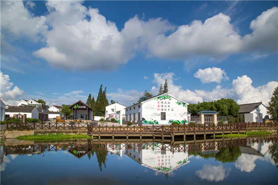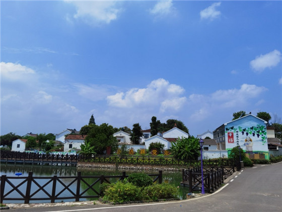 在丁莊村紫櫻湖畔,走在青磚鋪就的小徑上,青磚白瓦的民居錯(cuò)落有致,幾口大水缸放置院中,土屋阡陌、蛙鳴犬吠……這里頗有陶淵明《桃花源記》中隱世田園的味道。