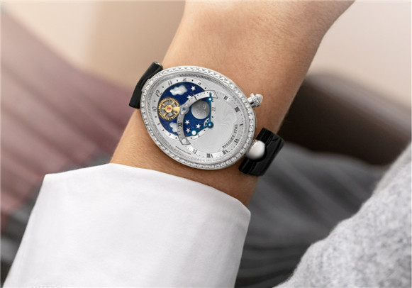 寶璣Reine de Naples那不勒斯王后系列8998晝夜顯示腕表,傾情描繪太陽與月亮之間若即若離的渴慕,在表盤上驛動(dòng)起美輪美奐的光陰之舞。為此,寶璣研制出專利技術(shù)機(jī)芯,布局出雙表盤顯示,一個(gè)以傳統(tǒng)方式顯示時(shí)分,第二個(gè)顯示日夜時(shí)間復(fù)雜功能。為了呈現(xiàn)出日月臨空的奇幻景象,寶璣選用青金石盤代表藍(lán)天,藍(lán)天上嵌入天然珍珠母貝的白云、金質(zhì)的星星、以及手工鐫刻的鈦金屬月亮圖案。然而,這片天空中的巨星當(dāng)屬照耀萬物的太陽,平衡擺輪外圈切割面的反射如同太陽的縷縷金光。夜晚觀時(shí),月亮懸于太陽之上,宛如一輪明月高掛。伴隨平衡擺輪運(yùn)作,一整天,陽光從鋼制表橋間穿透而過,投射在時(shí)分針上,而當(dāng)與鈦金月亮面對(duì)面時(shí),太陽的光輝達(dá)到頂點(diǎn),好似在傳達(dá)愛意,而月亮也報(bào)以溫柔回望。