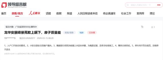 人民網(wǎng)深圳3月22日電(陳育柱、曹歡慶)近日,有多位深圳市民通過人民網(wǎng)“領(lǐng)導(dǎo)留言板”反映,龍華區(qū)人才房“安居峰景苑”質(zhì)量存在諸多問題。目前,龍華區(qū)已成立專項(xiàng)處置工作組。